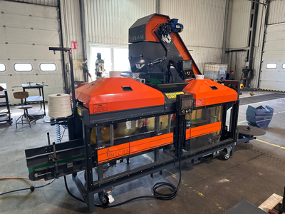 Po přesném odvážení porce přichází na řadu RM 30, automatický pytlovací (rašlovací) stroj. Tento stroj je určen k plnění pytlů sít’oviny (rašlových pytlů) předem odváženými porcemi zeleniny a jejich pevné uzavření. V naší instalované lince RM 30 přebírá porce brambor a cibule z váhy a balí je do pytlů velmi efektivně. Hlavní přednosti RM 30 zahrnují: