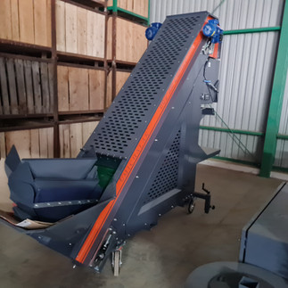 Podávací dopravník 50x250 cm – šikmý dopravník, který plynule propojuje výstup z příjmového koše se vstupem na třídicí stůl. Zajišťuje rovnoměrné předávání proudu brambor či cibule na další část posklizňové linky.