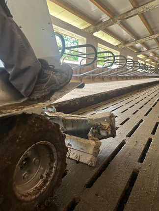 Samotný pohon obstarává 24 V elektromotor napájený z AGM akumulátoru. Nabíjení probíhá přímo ze zásuvky 230 V, takže nejsou potřeba žádné drahé wallboxy ani externí nabíječky. Pojezd je plynule regulovatelný do zhruba šesti kilometrů za hodinu – ideální rychlost, aby se krmivo posunovalo rovnoměrně, ale zároveň nedocházelo k rozhození směsi. Nadstandardní trakci ve vlhkém prostředí stáje zajišťuje hluboký traktorový dezén kol.