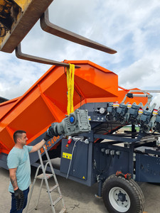Montáž bočnic násypky: Jedním z prvních montážních úkonů bylo připevnění bočnic k vlastnímu tělu příjmového koše. Tyto ocelové stěny zásobníku byly pro přepravu demontovány, aby se zmenšila šířka stroje. Nyní jsme je pomocí šroubů a vzpěr pevně uchytili po obvodu násypky. Bočnice výrazně zvyšují objem násypky a zajišťují, že při vykládce nebude materiál vypadávat ven. Po dotažení všech spojů tvoří bočnice integrální a pevnou součást zásobníku.