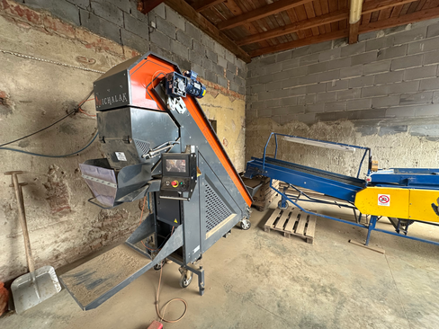 Příjmový koš Michalak KRM 1200 3T s třídicími válečky a odvodovými dopravníky pro separaci různých velikostí brambor. Před samotným vážením a balením probíhá naskladnění a předtřídění úrody pomocí příjmového koše KRM 1200 3T. Toto zařízení měl zákazník na farmě již z dřívějška instalované od naší firmy, čímž zefektivnil vykládku brambor a cibule z přívěsů se zadním sklápěním. KRM 1200 3T je robustní přijímací koš, do něhož lze vysypat sklizeň přímo z traktoru nebo nákladního vozu. Zásobník je osazen hlavním gumovým pásem o šířce 120 cm s nastavitelnou rychlostí posunu v rozsahu 0,5–4,5 m/min. Díky tomu lze plynule regulovat průtok materiálu a sladit výkon koše s navazujícími stroji na lince.